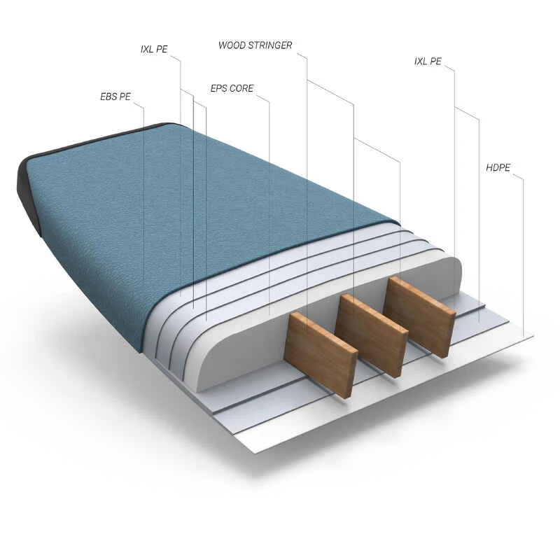 | Solidité | mousse renforcée et protections rails et extrémités . 3 stringers bois. |